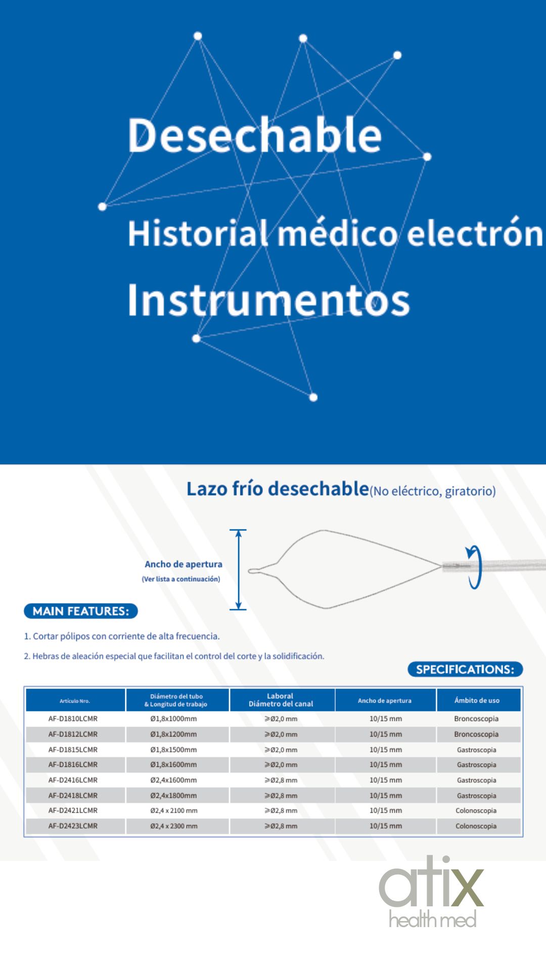 El Asa de Polipectomía Alton No Rotable CON o SIN Alta Frecuencia es un instrumento diseñado especialmente para procedimientos de colonoscopia en los que se requiere una resección precisa y segura de pólipos sin el uso de energía eléctrica. Su diseño no rotable garantiza mayor estabilidad durante la maniobra, facilitando un control óptimo en zonas anatómicas delicadas.
