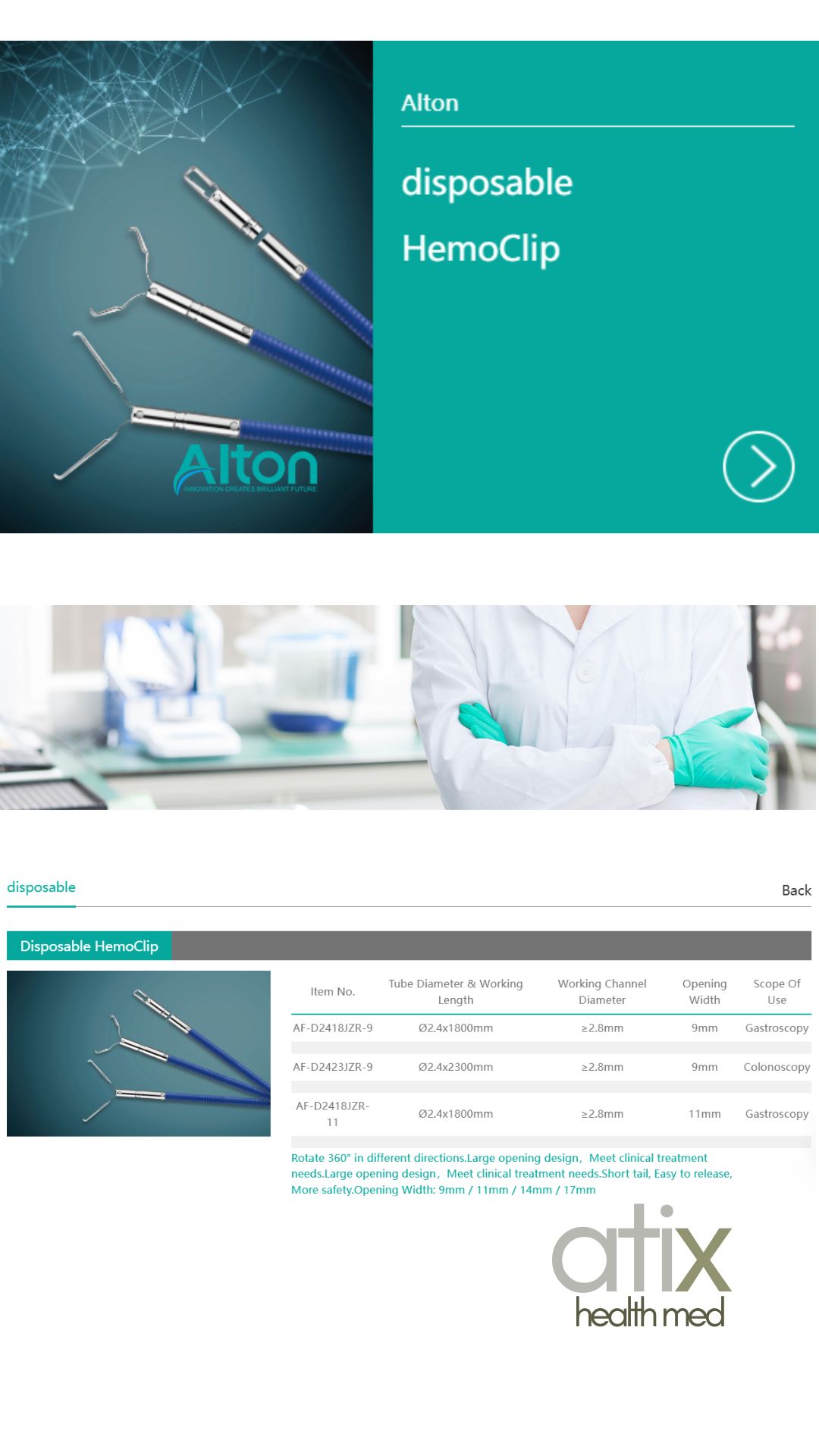 El HemoClip desechable de Alton Medical es perfecto para su uso durante procedimientos posoperatorios, especialmente en ESD y EMR, para lograr una hemostasia eficaz, cerrar lesiones y fijar suturas de nailon. Su fácil liberación y rotación de 360 grados lo convierten en una herramienta fiable y eficaz para diversos tratamientos terapéuticos en endoscopia gastrointestinal.